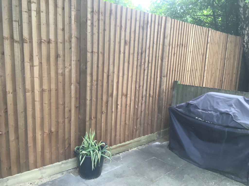 This is a Closeboard Fence in Staines which I supplied and installed. Brown UC4 100mm x 100m treated posts, pressure treated feather edge boards, arris rail and gravel board were purchased from Lawsons Timber.